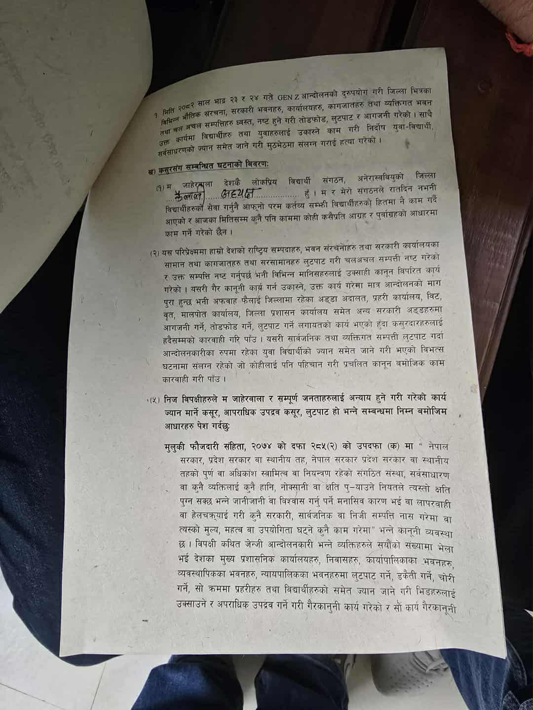 देशभर आन्दोलनमा हिंसा भड्काउन भूमिका खेलेको भन्दै जाहेरी दिएको खड्काले बताए । जाहेरीसहित भिडिओ, फोटो तथा फुटेजसहित पेनड्राइभमा प्रमाण राखेर बुझाइएको छ ।
