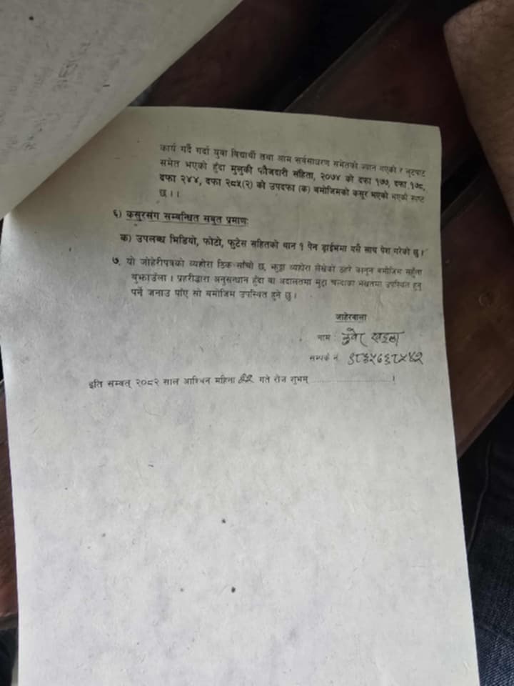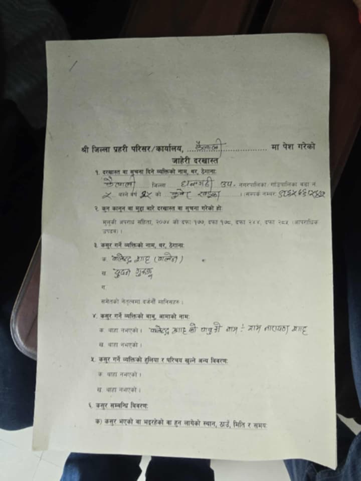 एमालेनिकट विद्यार्थी संगठन अनेरास्ववियुका कैलाली अध्यक्ष कुवेर खड्काले किटानी जाहेरी दिएका हुन् । प्रहरीले जाहेरी बुझेको छ । तर, दर्ता हुन बाँकी छ ।